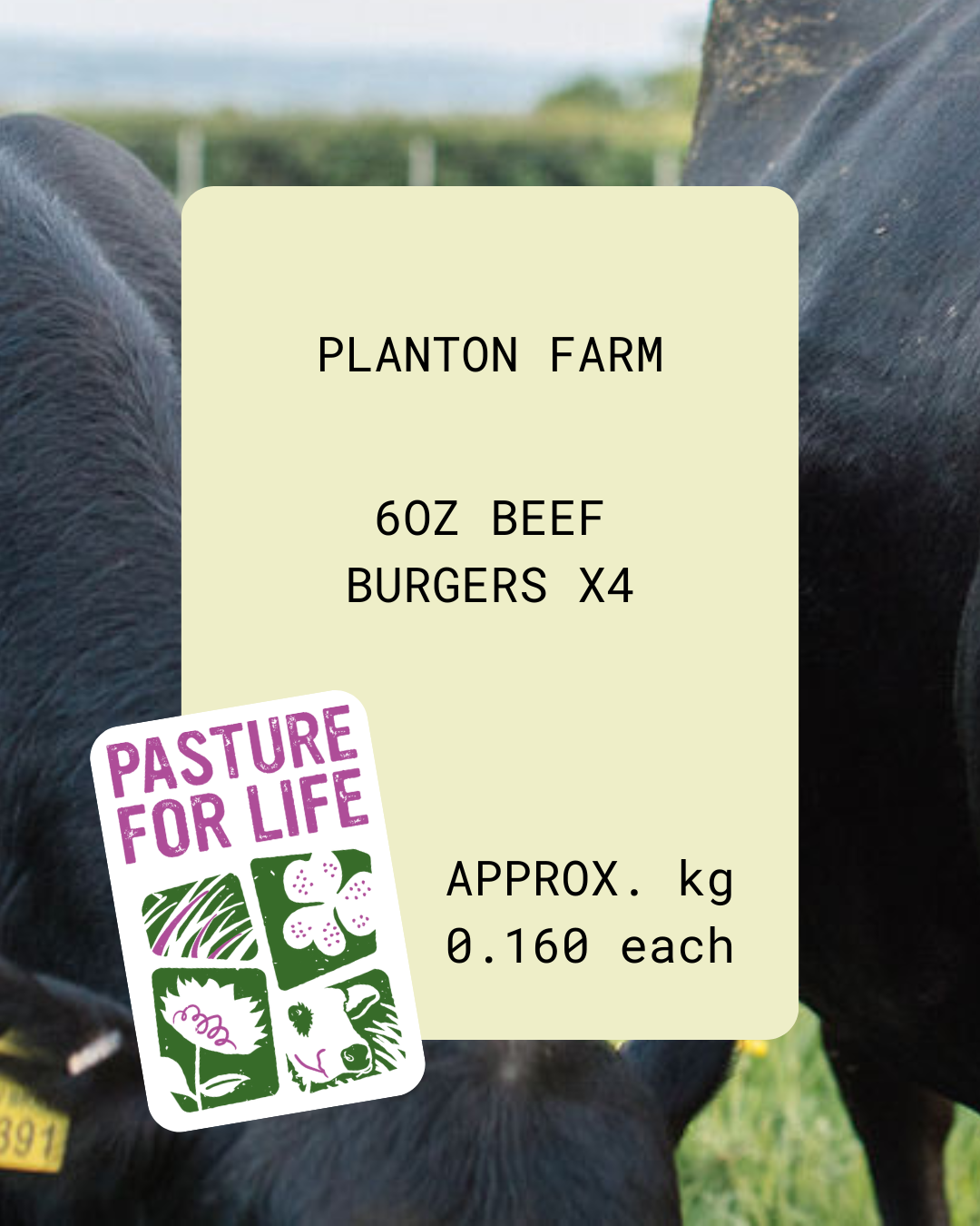 This pack contains four generous 6oz burgers from our herd of Pasture for Life certified Aberdeen Angus Cattle.