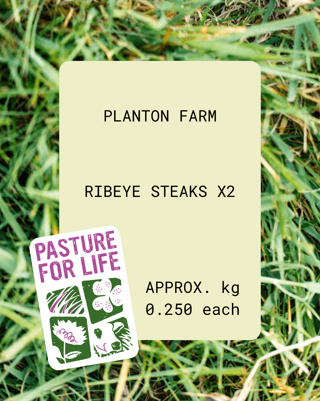 Two ribeye steaks, renowned for their succulence and deep marbling. Raised on organic, species-rich grasslands, these steaks offer a melt-in-the-mouth experience and a true taste of regenerative farming.